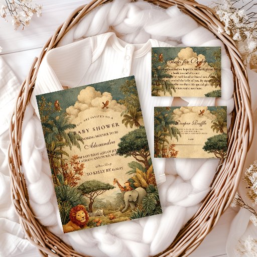 Welcome guests to a warm and whimsical celebration with this Safari-themed baby shower design. Featuring a sweet trio of jungle friends — a giraffe, elephant, and lion — framed by rich boho foliage, earthy neutrals, and soft natural textures.