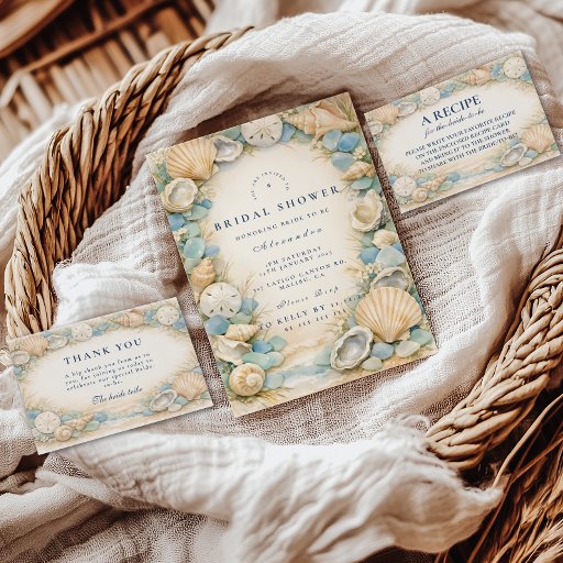 A refined coastal bridal shower design featuring an elegant oval wreath of seashells, oyster shells, starfish, and soft sea glass accents. Neutral sandy tones blend with muted ocean blues and delicate dune grasses to create a serene seaside aesthetic. The airy parchment background enhances the natural textures while maintaining a graceful, elevated look. Perfect for a beach-inspired celebration with timeless coastal charm.