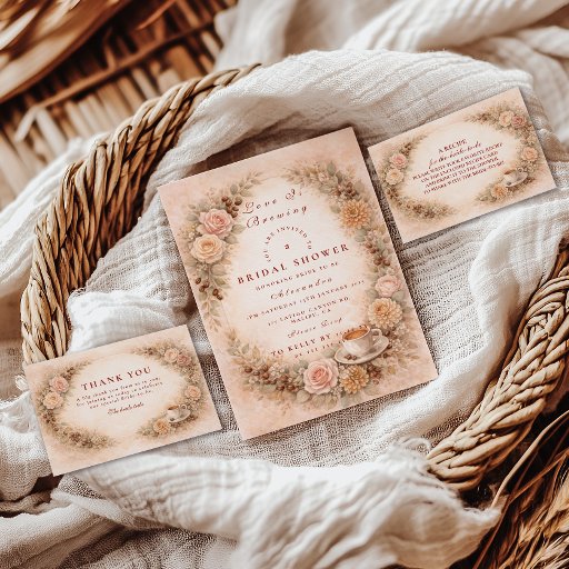 Chaleureux, romantique et d'une douceur sans effort, ce design de mariage sur le thème du café présente des roses blush, des grains d'espresso et un charmant détail de cappuccino superposé sur un fond de parchemin doucement vieilli. Les tons riches de caramel et de moka créent une atmosphère de café accueillante, parfaite pour les célébrations d'automne ou les réunions de brunch. La typographie élégante équilibre la chaleur rustique, ce qui en fait un choix idéal pour les amateurs de café et les mariées qui adorent les détails intimes et élégants. Un choix magnifique pour une célébration de mariage automnal remplie d'amour et de lattés.
