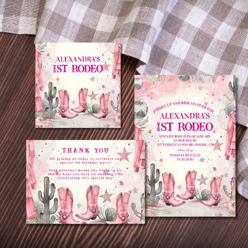 Celebrate your little cowboy’s first rodeo with this rustic western design! Featuring cowboy boots, hats, cacti, and red wildflowers, it sets the perfect scene for a country-style birthday party. Ideal for barn, farm, or outdoor celebrations with a vintage western touch.