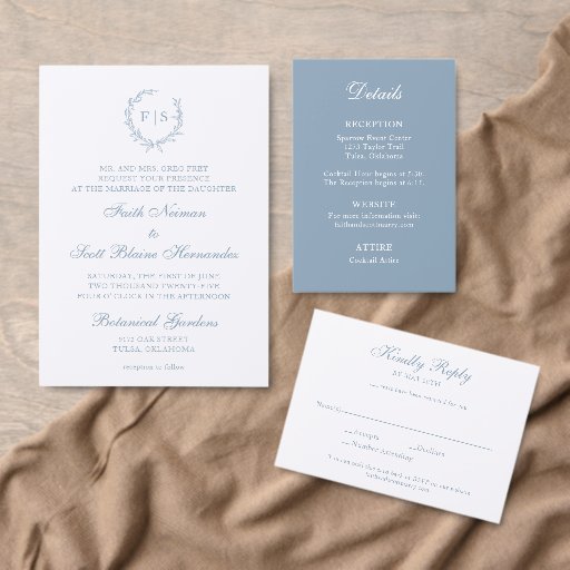 Personnalisez ces serviettes avec cette couronne de monogramme bleu clair qui contient vos initiales. Toutes les zones de texte peuvent être customisées pour correspondre à votre libellé unique. Utilisez-les pour les réceptions de mariage, les tables de gâteaux, les Fêtes des mariées, les dîners de répétition, et plus encore. Affichez l'ensemble de la collection pour créer un ensemble de mariages cohésif.