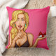 Gooi een kussens met een pop illustratie van een sexy blond meisje met cadeaudoos in hand en die vraagt om stilte.