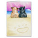Van Andie's oorspronkelijke inkt en gekleurd potlood schilderij: "Shore, they are Love Pugs". Met zwarte en flauwe pugs die de zonsondergang op het strand bekijken, zie je een paar stappen uit een zwoerd drukhart dat in het zand is getekend. c)2015 Andie.