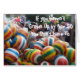 Un paquet énorme de ballons de plage colorés étant portés en bas de la rue par un vendeur entreprenant pendant une fiesta avec une foule dans le thebackground. Le slogan ici est "si vous n'avez pas grandi par l'âge 50, vous ne font pas doit ! ," mais vous peut changer le texte en votre propre message si vous souhaitez.