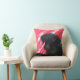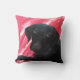 Zwart lab tegen rode marmer achtergrond op een 16x16 polyesterkussen