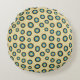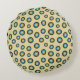 Ronde kussen met een patroon geïnspireerd op de prachtige blauwe rode octopus. Een lichtgele achtergrond met ringen van helder blauw, zwart en bruin.