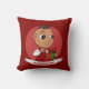 Drijf kussens met een afbeelding van een schattig glimlachend gelukkig meisje of jongen, de baby draagt rode en witte kleren en houdt een cadeau vast; met bewerkbare tekst-sjabloon voor jouw naam of boodschap, kerstfeestdagen met een rode achtergrond