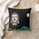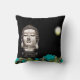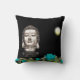 Een zilveren Boeddha-hoofdstandbeeld dat zich reflecteert op zwart water gevuld met drijvende turquoise lotus bloemen en groene lily pads. Zwarte achtergrond.