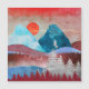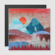 Een prachtig abstract landschapsontwerp met berg- en bosscène en een adelaar die op een boom landt in levendige tinten blauw, cyaan, zilver en karmozijnrood.
