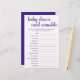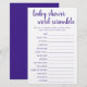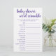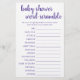 Débrouillez les mots de bébé ! Un baby shower simple ou un genre dévoilent un jeu de partie de course de mots (avec les réponses ci-dessous) avec un script amusant et décontracté écrit à la main. Le design classique comprend une superposition de la typographie de citation à la main moderne. Pour d'autres couleurs ou produits correspondants, veuillez visiter le magasin JustFharryn Zazzle, ou contacter le concepteur, c/o Fharryn@yahoo.com Tous droits réservés. #bohochic #zazzlemade TOUCHE DE RÉPONSE : Bib, Play Pen, Rattle, Berceau, Shampooing, Porte bébé, Couverture, Un côté, Sac de couches, Poussette, Moniteur de bébé, Lullaby, Pacifier, Bouteille
