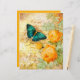 Grote staartvlinder in blauw groen met oranje rozen, bladeren en grijze ephemerscriptachtergrond.