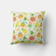 Een felgekleurd kussen versierd met afbeeldingen van citrusvruchten geschilderd in waterverf, waaronder grapefruit, sinaasappel, citroenen en meer!