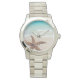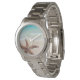 Eén zeesterren op het strand, zeeoor wacht afbeelding. Iedereen die van de zeebodem houdt, zal deze prachtige strandscène waarderen met turkooise oceaanwater en zachte golven langs het gladde strandzand. Een enkele bruine zee ster versiert de onderste hoek. Dit volwassen, zilveren bandhorloge kan worden veranderd in een versie van een kind.