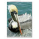 Na een succesvolle lunchduik in het water nabij het oceaanuiteinde van het kanaal van het schip, rust een pelikaan op een steentrots, aangezien de lenteshuesjes helpen zijn veren te drogen. Op Port Canaveral, Florida.