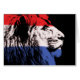 Slaapend leeuwenprofiel gekleurd met rode, witte en blauwe kleuren op een zwarte achtergrond.