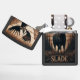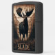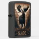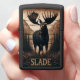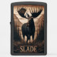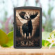 De geest van het bos wordt belichaamd door een majestueuze eland die trots tussen de hoge dennen staat in deze rustieke zwart-wit illustratie. Een subtiele maan werpt zijn licht op de scène, waardoor het thema van de wildernis wordt versterkt. De eland, met zijn gedetailleerde gewei en krachtige lichaamsbouw, is het brandpunt. Een decoratieve rand van bladeren en bladeren omringt het afbeelding. "SLADE" is geschreven in een gedurfd, houtachtig lettertype aan de onderkant, geplaatst tegen een getextureerde houten achtergrond die lijkt op planken, waardoor het een , gegraveerd gevoel krijgt.
