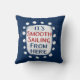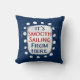 Vetgedrukte tekst met de tekst "Smooth Sailing From Here" is gecentreerd tegen een marineblauwe achtergrond. De rode en blauwe tekst staat op een witte rechthoek met grote getextureerde witte stippen eromheen, waardoor een speels contrast ontstaat tegen de achtergrond van de effen kleur.