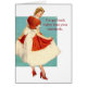 Een illustratie van een retro vrouw die zichzelf bewondert in haar nieuwe rode en witte jurk en rode hakken. Ze houdt de volledige rok van de jurk aan beide zijden vast en glimlacht omdat ze weet dat ze er geweldig uitziet. De saaie opmerking aan de voorkant van de kaart? "Ik heb hakken hoger dan je normen." De binnenkant van de kaart is leeg voor je eigen bericht.