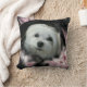 Deze schattige kussen of Pillow is voorzien van Snowdrop, een kleine Malteese hond. Een kant show haar portret dat zich bevindt in een artistieke creatie van roze bloemen en zwarte kant, wat het afbeelding een ongewoon en dramatisch effect geeft. Aan de andere kant zit ze onder een mooie roze Cosmos bloemen met een zachte zomerbries die haar lange zijdeachtige witte vacht blaast.