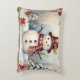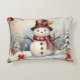 Een lachende sneeuwman in een rood pet en sjaal wordt omringd door besneeuwde boompjes en bloemetjes op dit schattige en charmante accentkussen.