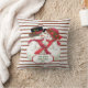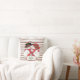 Dit schattige ontwerp heeft een stijl, sneeuwpop en sneeuwvrouw met rode sjaals en vakantie-petten. De achtergrond is opgebouwd uit rode en witte snoeprietstrepen en kan worden aangepast. De tekst op de onderkant luidt, "ONZE EERSTE KERST - 20XX" en kan worden gepersonaliseerd. Dit ontwerp is aan beide kanten van het kussen.