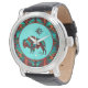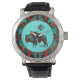 Dit is een unieke "Een van de soort" Southwest Buffalo Watch! Het is voorzien van een Southwest Buffalo Silhouette en een zon op een Turquoise Achtergrond... omringd door een Turquoise, Oranje en Zwarte Grens. Origineel kunstontwerp door artiest Kerry Miller.