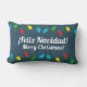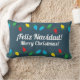 Een leuk kerst kussen ontwerp in het Spaans en Engels. Er staat "Feliz navidad!" en "Vrolijk kerstfeest." Het ontwerp is zeer feestelijk met kerstverlichting.