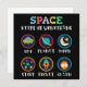 Playful space themed artwork made for curious kids and young students. Cute symbols like UFO, planet, moon, stars, rocket and alien help children explore space science and basic astronomy in a fun and friendly way.