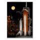 De Space shuttle Discovery bevindt zich op het lanceerpad 39A in het Kennedy Space Center in Cape Canaveral Florida. Een bijna volle maan gloeit in de nachtelijke hemel om een dramatische achtergrond toe te voegen.