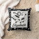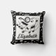 Mooie muziekkussens hebben een zwarte en witte achtergrond met muzieknoten en een verdrievoudigde logo en ruimte om je met een naam te personaliseren.