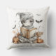 Spells & Stories - Mummy in the Pumpkin Patch Sierkussen Een gezellige mummie gewikkeld in zacht wit verband zit met gekruiste benen, het lezen van een boek met brede, expressieve ogen. Rondom het personage stralen gloeiende jack-o'-lantaarns met persoonlijkheid, suikermaïs morst over herfstbladeren en kleine vleermuizen fladderen over het hoofd. Een pompoen fungeert als een feestelijke drink, compleet met een gestreept rietje. Het ontwerp combineert Halloween-magie met stille verwondering en legt de charme van het griezelige seizoen vast door middel van verhalen, zoetheid en zachte grillen.