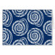 De kaart van de nota in een blokdrukpatroon, dat op een spiraalklem wordt gebaseerd, in wit op een kobalt blauwe achtergrond