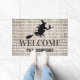 Spooky Black Witch Halloween Doormat is uitgerust met een heks die op haar bruin vliegt met een kat, welkomstbord en familienaam sjabloon op wol geweven Burlap.Een perfect ontwerp voor Halloween.Klik op een persoonlijke knop om deze aan te passen met uw eigen tekst of familienaam.