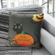 Een halloween kussen met een netelige maar schattige scène van een zwarte kat die achter een pompoen staat onder een volle maan. De vleermuizen vliegen over het hoofd van de katten.