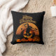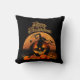 Halloween-kussen met spookachtige pompoenen, zwarte katten, vleermuizen, spinnen en volle maan op zwarte achtergrond met Happy Halloween-groet.