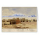 Waterverf schilderij met talrijke winkels en andere gebouwen, met twee mensen links en met sneeuw bedekte bergen in de buurt van Laramie in Wyoming.