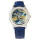 Handgeschilderde originele geschilderde kunstwerken werden gemaakt en tot leven gebracht in de vorm van een horlogeontwerp om samen te vallen met de "Glanzende Indigo" mode sieraden, horloges en accessoire design in het SPWW '25 collectie. Ik vind vreugde en liefde het veranderen van mijn schilderijen in tastbare home lifestyle producten voor iemands persoonlijke stijl wereldwijd, versierd met mijn persoonlijke handtekening. Kleuren werden gekozen door een contrasterend goud te willen koppelen aan een donker indigo blauw. Design die zijn gelabeld in "She Paints Wearing White" (SPWW), zijn collecties die zijn gemaakt en afgeleid van mijn sociale kanaal @IvoryxCane "Ivory + Cane." Ze zijn precies wat er wordt genoemd. Kunstcreaties geschilderd terwijl ik mijn oude witte trouwjurk droeg die nooit werd gedragen. Het was ontworpen met intentie, doel en een grotere betekenis dan zichzelf. Een deel van de opbrengst van alle verkopen binnen deze collecties die onder de SPWW vallen, wordt gedoneerd aan diensten en slachtoffers van huiselijk geweld in nood.