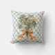 This St Patrick's Day pillow features a watercolor four leaf clover arrangement tied with and orange bow and a coordinating green and white gingham background on the front and on the back.