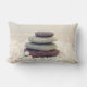 Een kussen met een foto met stenen stapels op elkaar. Omgeven door losse witte rotsen en kleine witte bloemen.
