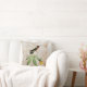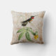 Het ontwerp van de vierkant werpkussens is voorzien van een illustratie van de keelvogel met platbinding (Heliomaster constantii.) Een groene kolibrie met witte borst- en felrode keelstokken op een tropisch plant met een gele bloem, op een gebroken witte achtergrond met gouden zirlen en bloemsilhouettes.
