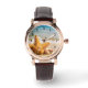 Een horloge met een schattige foto van een zeester rechtop in het zand. Onder zijn armen liggen 2 kleine schelpjes die comfortabel rusten. Gelegen op een strand met golven die op de achtergrond neerstorten.