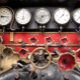 De stoomtreinbestuurders uitzichten vanaf de voetplaat van de spoorstaafgaten en -bedieningsorganen van de trein.