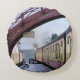 Een kunstontwerp van een stoomtrein en rode en gele wagens die op het treinstation wachten.