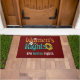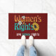 Pro Choice front door mat is voorzien van retro-stijl "vrouwenrechten zijn mensenrechten" tekst met madeliefje en zonnebloempjes op donkerrode achtergrond.