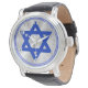 Mannen zwart lederen bandhorloge met een afbeelding van een koningsblauw davidster en koningsblauw dubbele rand op glanzend zilver. Optioneel zilveren klokgezicht. Zie bijpassende vierkante knop, ronde knop, ronde bedel, grote ronde premium metalen sleutelhanger en rond ketting. Zie het gehele Chanoeka Watch collectie onder de categorie ACCESSOIRES in de sectie FEESTDAGEN.