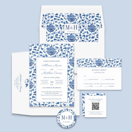 Ce design classique est composé d'un monogramme de couple simple et élégant avec arrière - plan d'impression chinoiserie bleu et blanc. Ce motif arrière - plan a été à l'origine peint en aquarelles par moi, avant d'être scanné sous forme numérique. Le motif s'inspire du style que l'on retrouve dans les pots de gingembre anciens.