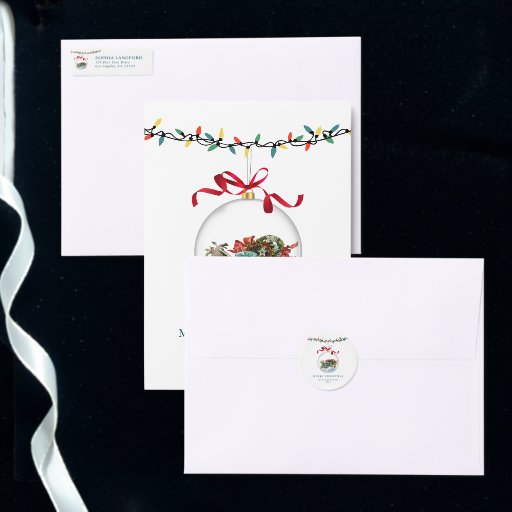 Cet autocollant festif présente un joyeux chapelet de lumières de Noël qui s'étire sur le dessus, avec un ornement de baules brillant avec un arc en ruban rouge suspendu en dessous, à l'intérieur, une charmante petite voiture porte un arbre de Noël, capturant l'esprit des aventures d'hiver douillettes. "Joyeux Noël" est élégamment exposé dans la typographie moderne, ajoutant une touche fraîche et élégante à la scène classique.
