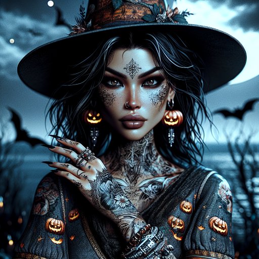 stickers de fête d'Halloween avec art de l'ai représentant une sorcière gothique avec tatouages, boucles d'oreilles citrouilles et chauves-souris.