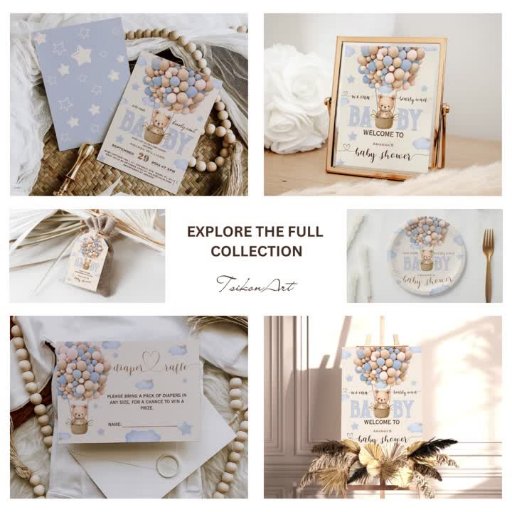 Voici l'adorable collection de Baby showers Teddy Bear de TsikonArt, dont l'ours le plus doux s'envole haut avec de adorables montgolfières colorées ! Cette collection présente un design irrésistiblement mignon, parfait pour célébrer l'arrivée imminente d'un petit. Notre attention aux détails et à l'art unique ont vraiment mis cette collection à part, comme toutes nos autres offres. Chez TsikonArt, nous sommes fiers de créer des designs exclusifs qui rendent vos moments spéciaux encore plus mémorables. Bienvenue dans ce nouvel ajout de style avec notre collection unique de baby showers!