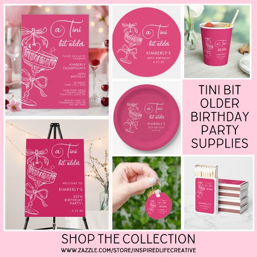 Celebrate her milestone 30th birthday with this trendy pink “A Tini Bit Older" birthday party! Personalize with your details and match the party vibe perfectly!